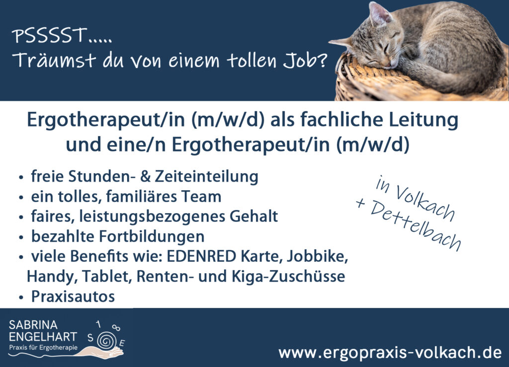 Dann bewirb dich bei uns – telefonisch unter (09381) 711 51 oder per E-Mail an mail@ergopraxis-volkach.de.
